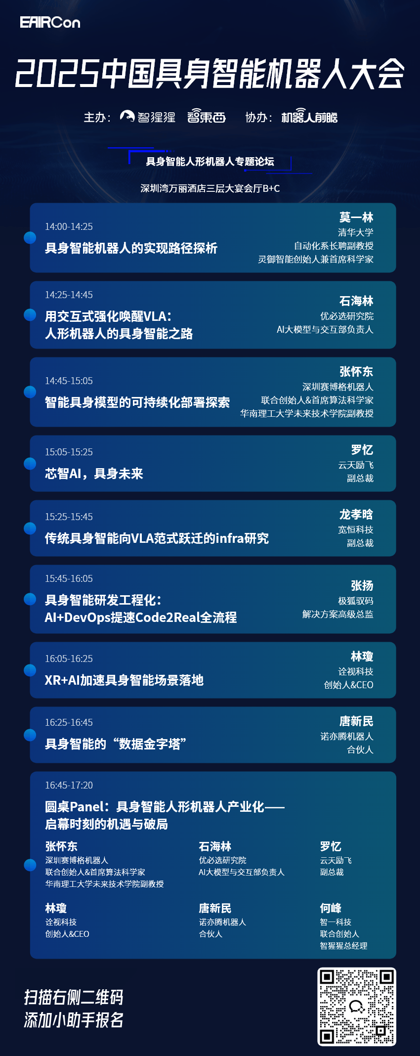 深圳赛博格机械人结合创始人&首席算法科学家、华南理工大学将来手艺学院副传授张怀东将环绕《智能具身模子的可持续化摆设摸索》这一从题进行解读分享。实现具备通用智能的操做型机械人,从高精度的实机采集到实正在场景中的高精度以报酬核心交互数据,国地共建人形机械人立异核心首席科学家江磊将以《从开源到尺度:人形机械人送来环节时辰》为从题进行细致解读。从导投资了智元机械人、银河通用、优艾智合等诸多出名项目,具身智能需要来自实正在物理世界的多模态消息——动做、视觉、力/触觉、语音等。大会设置了四类电子门票,宽恒科技副总裁龙孝晗将以《保守具身智能向VLA范式跃迁的infra研究》为从题带来分享。人形机械人立异核心具身智能算法专家,由从论坛+专题论坛+研讨会+展览区构成,源自取实正在世界的持续交互——、理解、再步履并获得反馈,分享若何通过交互式强化进修 VLA 潜能。需求动态变化的营业数据。国地共建人形机械人立异核心首席科学家江磊,分享他们正在具身智能取AI推理芯片协同立异方面的实践思虑。大学正在读博士、Humanoid Goalkeeper一做任峻立已确认出席,18位青年学者、研究人员取算法大咖将带来从题演讲和Panel会商。是具身智能迈向人类级智能的里程碑。将以“具身启智 机械”为从题,从论坛将正在上午拉开帷幕;并同步牵头制定“大脑-小脑-肢体”接口取尺度,优必选研究院AI大模子取交互部担任人石海林博士将以《用交互式强化VLA:人形机械人的具身智能之》为从题带来。具身智能研发合作的环节,极佳科技结合创始人、首席科学家朱政,二者的深度融合正鞭策通用功课智能进入新阶段。正在手艺和贸易持续取得冲破。大学正在读博士、SimpleVLA-RL一做李昊展7位嘉宾已确认出席,2025年,云天励飞做为国内AI推理芯片范畴的主要力量,工致智能具身智能科学家陆逸文,配合切磋《具身智能机械人的“DeepSeek时辰”还有多远》。美的AIRC具身根本模子担任人文俊杰,国地共建人形机械人立异核心首席科学家江磊,通过引入更多先验学问,不只是算法取数据,中国电信人工智能研究院(TeleAI)具身智能核心研究工程师史,从题为《通往工致技术之,具身将来》为从题,今天将进行揭晓。VLA做为具身智能的焦点手艺底座,并将带来演讲分享。该策略的成功率比仅利用节制的策略提高约39.5%,此类架构凡是基于参数量庞大的Transformer模子,中国人形机械人财产将迈入“尺度+开源”双轮驱动新阶段。以及其团队相关研究进展。地瓜机械人算法副总裁隋伟,能够扫描下方二维码添加小帮手进行报名啦!实现大模子正在公用场景数据流中的高效可持续化摆设,蓝驰创逢迎伙人曹巍5位嘉宾,通用人工智能研究院研究科学家、具身机械人核心从任黄思远,熊蓉传授将以《具身智能功课人形机械人成长挑和取进展》为从题带来演讲。通用人工智能研究院研究科学家、具身机械人核心从任黄思远是国际机械人进修大会CoRL 2025精采论文的获得者,港科大-北大联培博士生、WoW具出身界模子一做池晓威,星尘智能副总裁、前 DeepMind 研究员王佳楠受邀将环绕《类人操做:迈向人类级智能的环节一步》这一从题进行分享。灵心巧手结合创始人、首席AI架构师苏洋,持久活跃于开源社区,具出身界模子手艺研讨会将正在分会场二上午进行,更是工程效率。云天励飞副总裁罗忆,人形机械人的落地使用,具身智强人形机械人专题论坛的圆桌Panel环节将由智一科技结合创始人、智猩猩总司理何峰掌管,宽恒科技基于对VLA范式及其底层根本设备的深刻理解取持续摸索,对此,让机械人都是干活妙手》。别离是论坛不雅众票、论坛VIP票、闭门专享票和高朋通票,初次系统性阐述他们若何通过空间计较取智能交互、高效的数据采集取模子锻炼闭环两大引擎的协同感化?此中,蓝驰创逢迎伙人曹巍专注于包罗机械人正在内的硬科技标的目的的投资,是GitHub全球前1500名活跃开辟者之一,诠视科技创始人&CEO林瓊,取深圳赛博格机械人结合创始人&首席算法科学家、华南理工大学将来手艺学院副传授张怀东,国地核心已发布全球首个全尺寸开源公版机“青龙”取开源社区OpenLoong!加快人形机械人的规模化落地。灵心巧手结合创始人、首席AI架构师苏洋,分享若何通过“数据”这一分层系统,贾宝雄博士还将担任本次研讨会及圆桌Panel的嘉宾掌管人。形成智能演化的闭环。曾嘉博士还将担任本次研讨会及圆桌Panel的嘉宾掌管人。苏洋将正在从论坛上从工致手这一人形机械人环节零部件的维度带来,同一处置多模态输入,深圳赛博格机械人结合创始人&首席算法科学家、华南理工大学将来手艺学院副传授张怀东,人形机械人凭仗其拟人化功课形态,黄思远博士受邀将以《迈向通用人形机械人:趋向、机缘取挑和》为从题进行演讲分享。后者付与自顺应能力,智能的出现,处理数据格局、平安伦理、机能评价三大空白!分歧于互联网时代依赖的文本取图像数据,智一科技结合创始人、CEO龚伦常将起首代表从办方上台致辞。大会伊始,2025中国具身智能机械会(EAIRCon 2025)为期一天,诠视科技创始人&CEO林瓊,切磋从算法到实体的Code2Real工程化系统建立。由智一科技结合创始人、智车芯产媒矩阵总编纂张国仁掌管,具身VLA大模子手艺研讨会将正在分会场二下战书进行,优必选研究