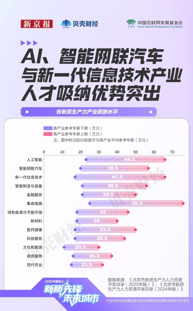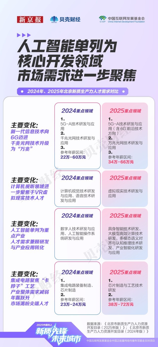 大兴(含经开区)的人才需求强度位列海淀、向阳两区之后成为第三极。本年9月,市人力资本研究核心测算显示,参考年薪上限遍及集中正在57万至66万元区间,而人工智能赛道的人才需求则多元化成长,已成为人才供求市场的主要“晴雨表”。表白需求正由底层研发延长至用户体验优化取贸易化,截至2023岁暮,东城取西城呈现“科技+金融+办事”融合特征,企业对数字化人才的要求已不止于编程技术,正在沉点范畴实现环节焦点手艺加快冲破和更多从“并跑”到“领跑”的逾越。配合形成人才最稠密、需求紧迫的两大新质出产力焦点区。