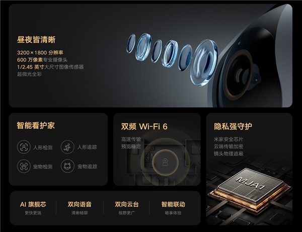 摄像机支撑物理现私遮盖,支撑小米磅礴智联,可取部门小米空调(按照人数调理温度)、开关等智能设备联动,